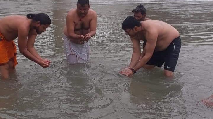 फोटो कैप्शन:  कैलाश मंदिर गंगा यमुना मैया घाट पर संकल्प लेते कैलाश मंदिर महन्त गौरव गिरी, आचार्य सुनील, श्री बांके बिहारी वेलफेयर सोसायटी संस्थापक अध्यक्ष डॉ मदन मोहन शर्मा व अन्य।