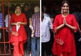 अपनी फिल्म की सफलता के लिए सोनम कपूर शनिवार की सुबह शनि भगवान के दर्शन करने पहुंची इस मौके पर सोनम देसी लुक में नजर आई। इस मौके पर फैशन क्वनी ऑल रेड लुक में नजर आई। रेड सूट के सात उन्होंने छोटा-सा रेड पर्स और रेड जूती पहनी थी, जिसमे सोनम खूबसूरत लग रही थी। सोनम ने मिनिमल मेकअप और कानों में बड़े-बड़े झुमके पहने हुए थे जिसमे वो बिल्कुल जच रही थी। हेयरस्टाइल की बात करे को उन्होंने लो-बन बनाया हुआ था।