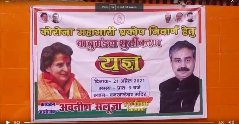 कानपुर:पी०रोड० स्थित वन खंडेश्वर मंदिर में उत्तर प्रदेश कांग्रेस कमेटी के सदस्य अवनीश सलूजा के नेतृत्व में यज्ञ का आयोजन किया गया।जहाँ एक तरफ कोरोना महामारी के दूसरे अटैक ने एक बार फिर से दस्तक दी है। और इसने पूरे देश को हिला कर रख दिया है। यही नही अब तो चारो तरफ त्राहि त्राहि मची हुई है। इस महामारी से सभी को जल्द से जल्द निजात मिल सके। इसके लिए लोग अब भगवान से प्रार्थना भी कर रहे है। आज पी०रोड० स्थित वन खंडेश्वर मंदिर में उत्तर प्रदेश कांग्रेस कमेटी के सदस्य अवनीश सलूजा के नेतृत्व में दर्जनो कांग्रेसियो की उपस्थिति में इस महामारी के प्रकोप को कम करने और वायुमंडल को शुद्ध करने के उद्देश्य से यज्ञ का आयोजन किया गया।