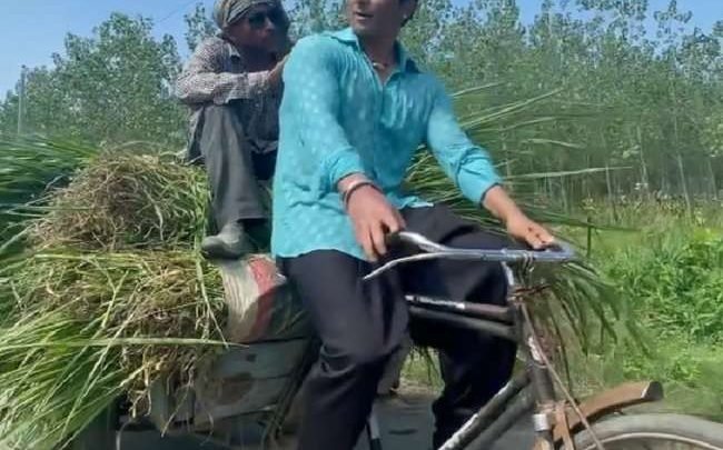 रिक्शे में पशुओं का चारा भी रखा हुआ है। वहीं चारे पर खुद