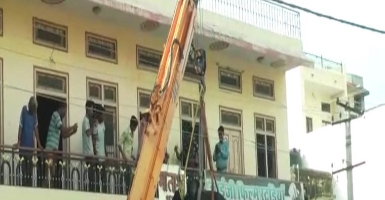 दो मंजिला मकान की छत पर चढ़ा सांड नीचे उतारने बुलानी पड़ी क्रेन