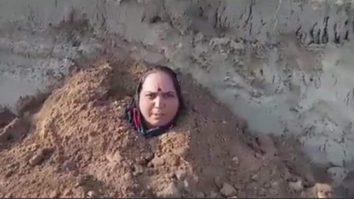 कि जब तक भू.माफियाओं के खिलाफ कार्रवाई नहीं होती तब तक वह अन्न-जल ग्रहण नहीं करेगी। महिला ने अपना पूरा शरीर जमीन में गाड़ लिया, केवल उसके सिर का हिस्सा जमीन के बाहर निकला हुआ था । ऐसी स्थिति में कई घंटे तक रही, पर प्रशासन ने आश्वासन देकर बाहर निकाल लिया है । ये मामला बाह तहसील अंतर्गत थाना सिकंदरा क्षेत्र के बाईपुर गांव का है बताया जा रहा है कि दबंगों ने सार्वजनिक भूमि पर भी कब्जा कर रखा है लेकिन राजस्व विभाग की मिली भगत होने के चलते कोई कार्रवाई नहीं होती गुरुवार को पीड़ित महिला के खेत पर लेखपाल और कानूनगो ने जबरन भूमाफियाओं का कब्जा करा दिया। इससे पहले भी दबंग महिला के खेत की दीवार को तोड़ चुके हैं। पीड़ित महिला ने मरते दम तक जमीन से बाहर न निकलने की बात कही है। महिला का कहना है कि मेरे मरने के बाद मेरे बच्चों को भी इसी में दफना देना। दबंग भूमाफियाओं ने सरकारी चक रॉड पर भी कब्जा कर रखा था। अभी हाल ही में राजस्व की टीम ने चक रॉड से अवैध कब्जा हटाया था लेकिन कब्जा हटाने के बाद भी कोई कठोर कार्रवाई नहीं की गई बताया जा रहा है कि दबंगई और रसूख के चलते अधिकारी कोई एक्शन नहीं लेते हैं। महिला के खेत में समाधि लेने की जानकारी मिलते ही प्रशासनिक अमले में हड़कंप मच गया आनन.फानन में मौके पर अधिकारी पहुंचे। उन्होंने पीड़ित महिला प्रेमलता को खेत की पैमाइश करने का आश्वासन देकर बाहर निकाला।