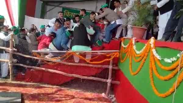 एसपी-आरएलडी की संयुक्त रैली में टूटी बैरिकेडिंग धड़ाम से नीचे गिरे नेता और कार्यकर्ता