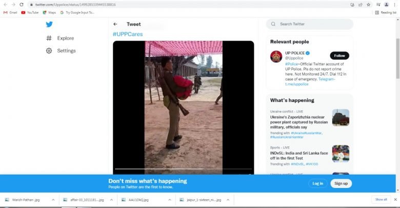 फिर देखने को मिली यूपी पुलिस की जिंदादिली पुलिसकर्मी ने बंदूक के साथ बुजुर्ग को गोद में उठाया