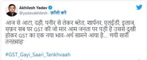 इस बढ़ोतरी पर सपा प्रमुख ने ट्वीट कर लिखा, “आज से आटा, दही, पनीर से लेकर ब्लेड, शार्पनर, एलईडी, इलाज, सफर सब पर GST की जो मार आम जनता पर पड़ी है, उससे दुखी होकर जीएसटी का एक नया भाव-अर्थ सामने आया है… ‘गयी सारी तनख्वाह’”