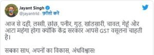 वहीं रालोद प्रमुख जयंत चौधरी ने ट्वीट कर लिखा, “आज से दही, लस्सी, छांछ, पनीर, गुड़, खांडसारी, चावल, गेहूं और आटा महंगा होगा क्योंकि केंद्र सरकार आपसे जीएसटी वसूलना चाहती है. सबका साथ, अपनों का विकास, अंधविश्वास!”
