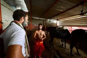 तेलंगाना के बोनालू फेस्टिवल में कोड़े मारने की परंपरा है… यह कोड़े ‘पोथाराजू’ बना व्यक्ति अपने शरीर पर मारता है… पोथाराजू, बोनालू फेस्टिवल की देवी महाकाली का भाई है, जो देवी की रक्षा के लिए चाबुक चलाता है… पोथाराजू को देवी महाकाली के विभिन्न रूपों वाली सात बहनों का भाई माना जाता है… राहुल गांधी ने अपनी यात्रा के दौरान यही अवतार अपनाया…रुद्रम में एक बच्चा कराटे ड्रेस में नजर आया… राहुल ने उसे बुलाया और उसकी पंचिंग प्रैक्टिस कराई… इस दौरान एक लड़की भी कराटे ड्रेस में नजर आई… राहुल गांधी जापानी मार्शल आर्ट फॉर्म अकीदो में ब्लैक बेल्ट हैं… 2013 में उन्हें ब्लैक बेल्ट से नवाजा गया था… वे मार्शल आर्ट सीखने के लिए जापान भी गए… वे नेशनल लेवल शूटिंग चैंपियन भी हैं… राहुल कई फाइटिंग आर्ट्स फॉर्म सीख रहे हैं…