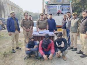 कन्नौज जिले के थाना सौरिख पुलिस ने ट्रक लूट करने वाले गैंग के तीन सदस्यों को गिरफ्तार करने में सफलता हासिल की है… इनके पास से 3 दिन पहले लूटे गए ट्रक कंटेनर नंबर एच आर 5 5 एजे 98 39 को बरामद किया है… जिसे पड़ोसी जनपद इटावा के भरथना क्षेत्र से लूटा गया था… पकड़े गए अपराधी कृपाल यादव, अजय देव, शिशुपाल हैं… जिनके पास से अवैध हथियार भी बरामद हुए है… घटना का खुलासा करते हुए पुलिस अधीक्षक कुंवर अनुपम सिंह ने बताया की ट्रक लूट की घटना को अंजाम पड़ोसी जनपद इटावा के भरथना थाना क्षेत्र से दिया गया था… जहां ट्रक चालक को बंदी बनाकर ट्रक कंटेनर लूट लिया गया था… गैंग के तीन सदस्यों को कन्नौज पुलिस ने गिरफ्तार करने में सफलता हासिल की है…