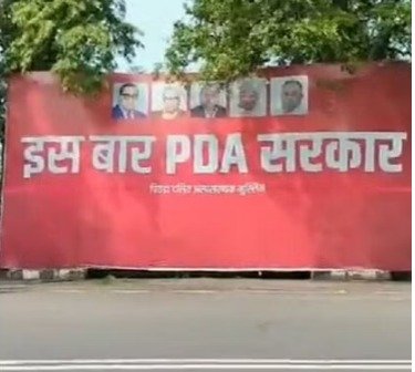 समाजवादी पार्टी कार्यालय के बाहर लगे पोस्टर, पोस्टर पर लिखा ‘इस बार पीडीए….