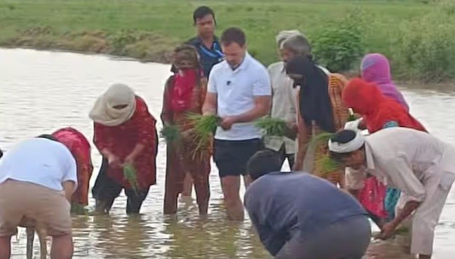 अचानक सोनीपत के खेतों में पहुंचे राहुल गांधी, किसानों संग धान की रोपाई की