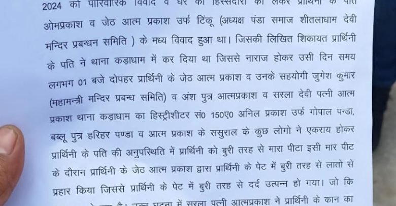 मामला कड़ा धाम थाना क्षेत्र का है जहा की महिता गुड़िया देवी ने एसपी बृजेश कुमार श्रीवास्तव को शिकायती पत्र देते हुए बताया है कि जमीन में हिस्सेदारी को लेकर उसके पति से उनके बड़े भाई से विवाद चल रहा है,महिला आरोप लगाया है कि विवाद के चलते एक दिसंबर को उसके जेठ आत्मप्रकाश पंडा जोकि माता शीतला धाम मंदिर समिति के अध्यक्ष है ने अपने बेटे अंश ,पत्नी सरला और हिस्ट्रीशीटर सहयोगी अनिल प्रकाश उर्फ गोपाल पंडा के साथ मिलकर उस पर हमला किया और जमकर मारपीट की है,मारपीट में उसके पेट में अंदरूनी चोट आई है,महिला ने आरोप लगाया है कि इसकी शिकायत जब वह पुलिस थाने में करने गई तो हिस्ट्रीशीटर से मिलीभगत के चलते पुलिस ने उसकी सुनवाई नहीं की और डांट कर भगा दिया।