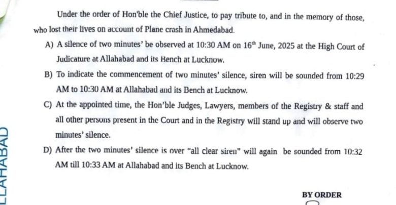 इलाहाबाद उच्च न्यायालय के माननीय मुख्य न्यायाधीश के आदेश के तहत, अहमदाबाद में विमान दुर्घटना में अपनी जान गंवाने वालों को श्रद्धांजलि अर्पित करने के लिए।