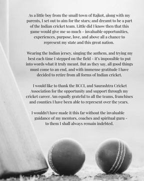 उन्होंने लिखा, “भारतीय टीम की जर्सी पहनना, राष्ट्रीय गान गाना और जब भी मैदान पर कदम रखा तब अपना बेस्ट देना- इन सभी चीजों को शब्दों में बयान करना मुश्किल है। लेकिन जैसा कहा जाता है, हर अच्छी चीज का अंत होता है। मैं पूरी कृतज्ञता के साथ भारतीय क्रिकेट के सभी फॉर्मेट से संन्यास लेने का एलान करता हूं।”