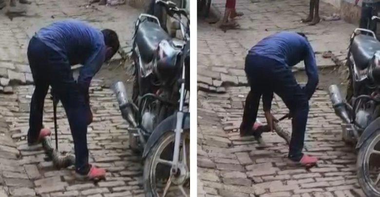 सड़क के बीचों-बीच बेजुबान अजगर को चाकू से बेरहमी से काटता हुआ दिखा युवक